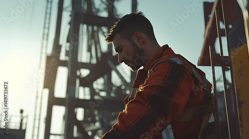 A male oil rig worker operating a crane on a platform. Featuring strength and precision