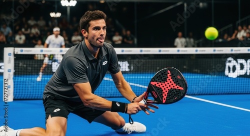 athlete, sport, tennis, racquet, court, ball, action, competition, match, game, player, male, man, sharpened, concentration, determination, energy, agility, movement, swing, forehand, backhand, serve, volley, rally, point, winning, losing, training, practice, professional, amateur, indoor, blue, surface, net, opponent, spectator, crowd, audience, stadium, arena, light