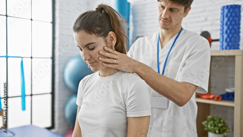 A male physiotherapist assesses a woman's neck in a modern physiotherapy clinic.