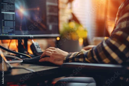 A male programmer of Caucasian descent working in a modern office environment, focusing intently on coding on his computer screens.