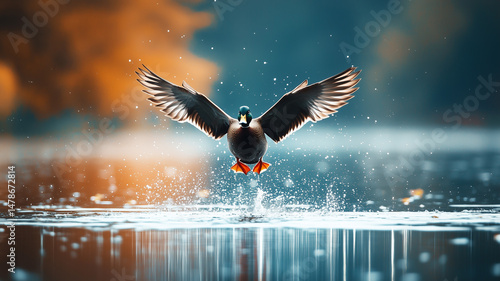 anas platyrhynchos, duck, flight, lake, wing, splash, water, bird, nature, wildlife, calm, feather, motion, air, sky, ripple, flying, animal, outdoors, beak, blue, environment, freedom, elegance, water bird, serenity, dynamic, duck, beauty, aerial, duck pond, avian, fauna, soaring, birding, movement, photo