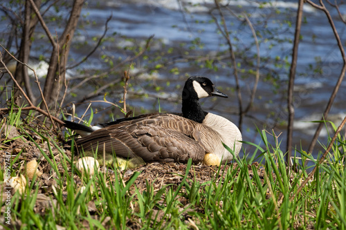 A mama goose hatching eggs. A goose mother hatching with it's goslings and eggs.
