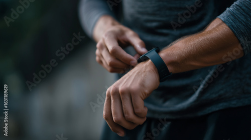 man, wrist, grey, outdoors, adjusting, band, fitness, technology, exercise, health, male, arm, vein, hand, finger, skin, clothing, sport, active, lifestyle, wearable, device, accessory, modern, style, casual attire, closeup, body, perspiring, physical exercise, wellness, digital, connectivity, monitoring, activity, tracker, electronic, contraption, time