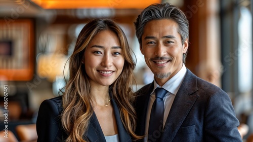 A man and a woman are dressed in a business suit. They are both smiling and are in an office space with modern decor.