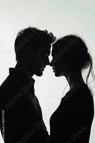 man, woman, silhouetted, against, white, background, couple, love, romance, kiss, intimacy, hugs, human relationships, affection, closeup, portrait, lighting, photo, shadow, sharpened, facing, left, side, right, both, away, camera, head, turned, toward, hair, pulled, back, ponytail, wearing, shirt, plain, wall, taken, low, angle, creating, sense, depth, perspective, black, making, difficult
