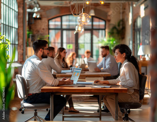a man and a woman are sitting at a table opposite each other in a large, bright office, with people working in the background. interview, negotiations, clients