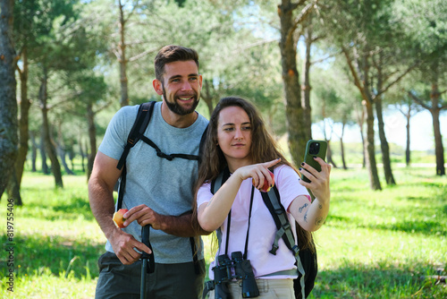 hiking, trekking, backpacker, check, route, map, phone, man, woman, two people, couple, together, lifestyle, happy, people, nature, young, caucasian, travel, vacation, female, adventure, leisure, outdoors, summer, forest, mountain, male, healthy, smile, fun, friendship, portrait, tour tourism, 2, holiday, self, smartphone, activity, mobile