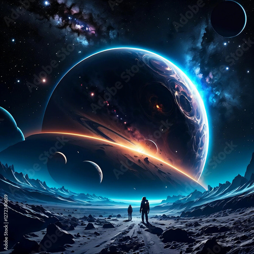 A man and woman are standing on a planet in space. The planet is surrounded by many other planets and stars. Scene is one of wonder and exploration