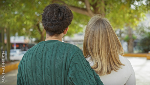 couple, love, woman, man, hugs, park, human relationships, city, outdoors, green, romance, affection, adult, togetherness, intimacy, partner, marriage, bond, peaceful, urban, leisure, lifestyle, companionship, trust, scenery, fashion, casual attire, tree, season, sweater, cosy, comfort, street, backview, shoulder, daytime, recreation, attachment, friends, oneness, casual clothes, strolling, public, sharing, moment, environment, town, harmony