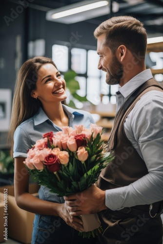 work, woman, flower, man, date, person, bouquet, female, male, positive, job, pretty, cheerful, pot, affection, birthday, emotion, employee, give, joyful, lovely, moment, romantic, businessman