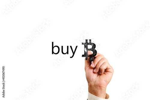 a man draws a bitcoin symbol next to the word buy. cryptocurrency concept