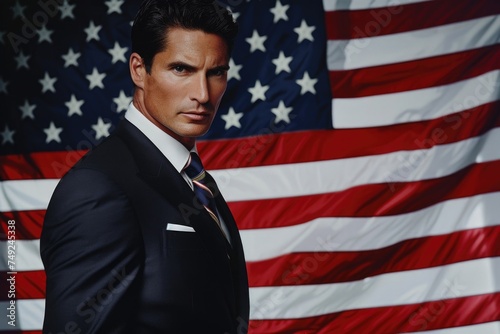 man, suit, standing, american, flag, pride, patriotism, formal, attire, national, symbol, business, serious, expression, setting, personal, appearance, value, government, official, professional, confident, leadership, respect, dignity, authority, 1, person, political, corporate, image, success, elegance, powerful, traditional, conservative, red, white, blue, ceremonial, representative, devotion, dedication, allegiance, liberty, democracy, honour, generative, ai