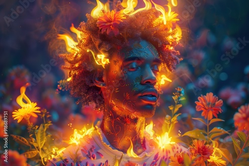 man, garden, fire, flames, flower, bloom, glow, warm, light, vibrant, colours, intense, atmosphere, nature, beauty, surreal, art, digital, artwork, surrealism, fantasy, magical, dreamlike, mystical, spiritual, transformation, energy, power, rebirth, life, death, cycle, human, body, soul, spirit, head, hair, skin, eye