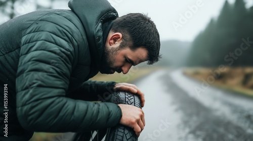 man, tire, road, rain, trip, flat, travel, challenge, examine, environment, nature, weather, mechanic, incident, motor, hardship, scenery, issue, contrast, sharpened, effort, direction, journey, remote, roadway, adventure, highlight, roadside, urban, rainy, moment, dilemma, sorrowful, lifestyle, problem, resolve, fill, water, respite, solitude, solo, safety, vehicle, repair, landscape, asphalt, frustration, day