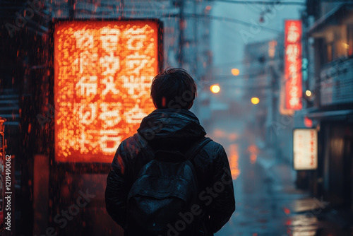 man, back, standing, wet, street, night, wearing, dark, hooded, jacket, backpack, around, him, blurry, urban, background, bright, neon, signs, japanese, 1, glow, orange, out, against, cold, blue, grey, raining, drop, visible, lighting, light, reflected, asphalt, atmosphere, image, feeling, loneliness, mystery, melancholy, person, city, rain, light, reflections, life, darkness