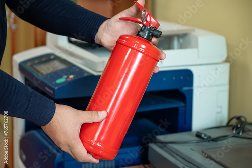 A man holds a fire extinguisher in his hands against the background of office equipment.