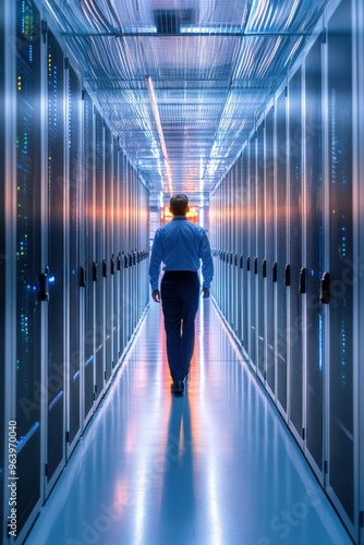 A man in a blue shirt and hard hat walks down a hallway of computer servers