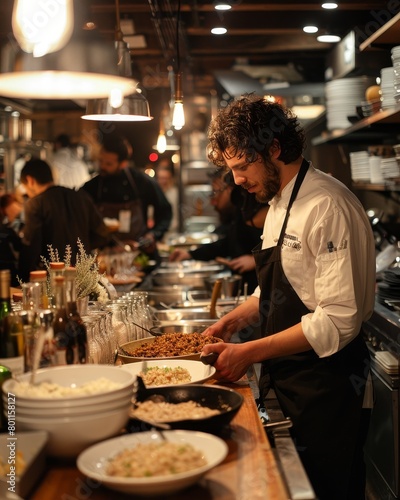 chef, food, eatery, kitchen, cook, person, adult, preparation, uniform, epicure, meal, indoor, man, dinner, cookery, plate, dish, professional, male, horizontal, white, caucasian, salad, occupation, photo, profession, job, working, hotel, adults only, apron, making, standing, color image, catering, hand, healthy, garnish, culinary, skill, expertise, pan, lunch, delicious, service, holding, one person