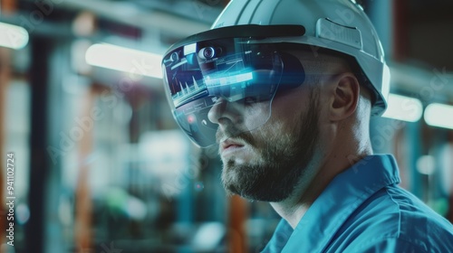 ar, industry, machinery, hard hat, blue light, technology, engineering, inspection, futuristic, innovation, safety-gear, high technology, manufacturing, digital display, manpower, technician, advanced technology, precision, industrial revolution, engineer