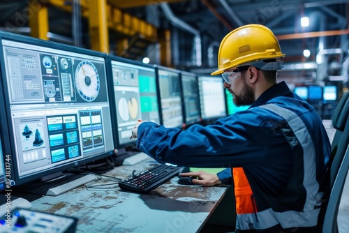 A man in a hard hat is focused on working with a computer to create custom reports using data, An engineer creates custom reports using data from a SCADA system