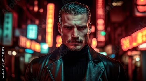 night, man, city, urban, street, neon, light, dark, city lights, portrait, fashion, cool, stylish, jacket, leather, model, male, photogenic, face, serious, confident, look, gaze, stare, background, glow, city landscape, streetlife, nightlife, city landscape, moody, city life, metropolis, modern, contemporary, downtown, attitude, expression