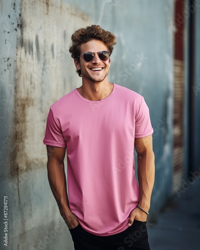 man, pink, t-shirt, smile, concrete, wall, fashion, model, style, casual attire, clothing, apparel, sunglasses, happy, confident, photogenic, male, urban, street, city, outdoors, portrait, standing, hand, pocket, wristband, accessory, relaxed, cool, casual clothes, trendy, men's fashion, summer, spring, comfortable, modern, contemporary, lifestyle, textile