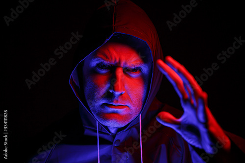 A man in a protective suit in a dark room. Halloween image concept. Virus protection. Illuminated with colored lights