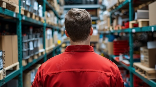 A man in a red jacket stands in a warehouse, facing shelves stocked with boxes and products.