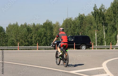 A man in a red suit on a black bicycle on the road against the background of a black car