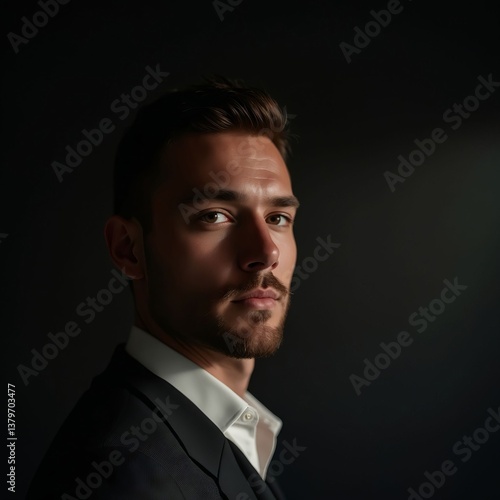 man, suit, white, shirt, looking, camera, beard, black, bow, attaching, business, cocktail, dress, dark, portrait, pose, stare, wear, young, formal, attire, wearing, hair, styled, short, styled, moustache, off, side, serious, expression, face, background, making, focal, point, lighting, soft, dramatic, creating, moody, atmosphere, taken, low, angle, highlighting, upper, body