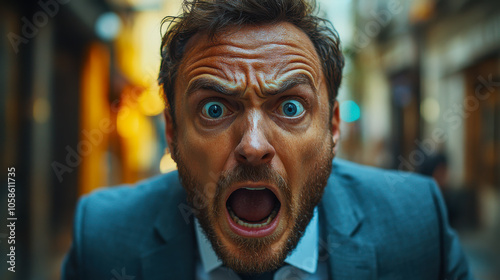 man, suit, anger, shouting, city, street, emotion, expression, urban, sunset, vibrant, colourful, people, tied-up, shop, intense, face, reaction, frustration, bewilderment, pedestrian, movement, crowd, business, environment, contrast, intensity, drama, energy, lifestyle, contemporary, male, vocal, feeling, outburst, excitement, metropolitan, life, tumult, confrontation, social, culture, dynamic, bustling, passion, scenery, surrounding, situation
