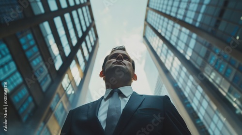 man, suit, standing, tall, building, city landscape, business, corporate, urban, professional, businessman, downtown, skyscraper, modern, architecture, successful, confident, career, city, office, financial, district