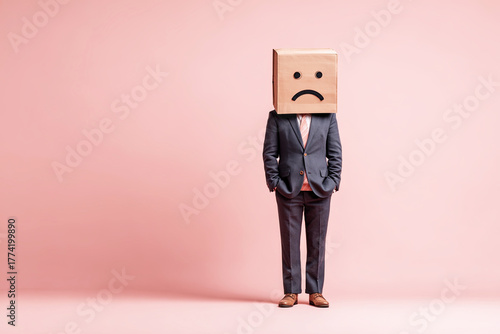 A man in a suit stands against a pink background, wearing a cardboard box as a head with a sad face, symbolizing emotions and identity.