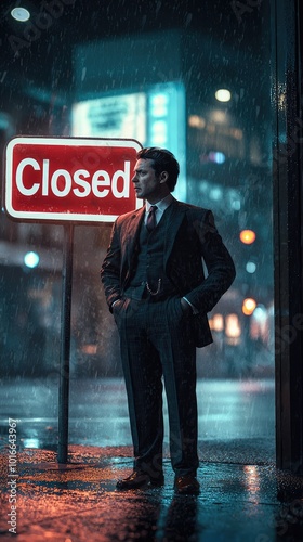 A man in a suit stands under rain beside a closed sign, embodying the essence of solitude in a vibrant urban nightlife.