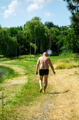 A man in a swimsuit walks across the grass by a lake in the summer season
