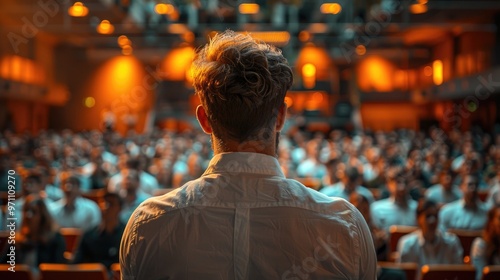 A man in a white shirt addresses a packed, crowded room filled with attentive listeners, standing before a warmly-lit modern indoor backdrop, embodying engagement and interaction.