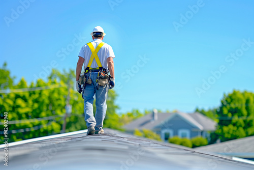 A man in a white shirt and yellow safety harness is walking on a roof