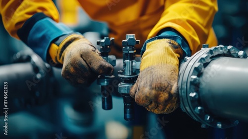 man, yellow, jacket, working, pipe, wearing, glove, wrench, equipment, hand, industrial, men at work, plumber, repairman, repair, tool, maintenance, engineer, gas, job, technology, fix, occupation, technician, valva, installing, pipeline, plumbing, heating, service, home, professional, metal, energy, house, construction, mechanic, boiler, crude oil, oil, closeup, water, person, handyman, expert, crude, pump, checking, inspector