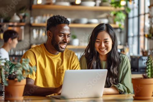 A man in a yellow shirt and a woman in a green shirt are happily working together on a laptop in a modern cafe