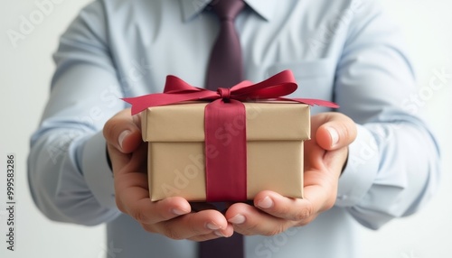 A man in business attire presents a gift box wrapped with a red ribbon, suggesting a formal occasion or thoughtful gesture. The scene emphasizes giving and appreciation.