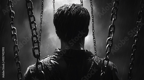 man, silhouette, chain, dark, shadow, abstract, mystery, alone, despair, hope, trapped, freedom, fear, anxiety, light, metal, background, art, black, white, photo, graphic, design, grunge, texture, dramatic, mood, emotion, concept, thought, symbol, lonely, gaol