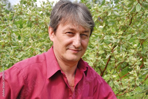 attractive, man, middle-aged, winsome, beautiful, summer, vacation, fun, haircut, pleasant, contented, park, forest, smile, people, man, 1, goggles, crimson