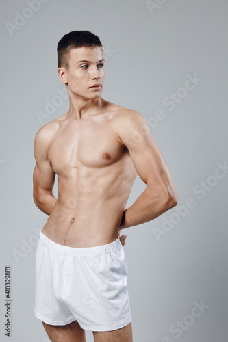 a man in white shorts holds his hands behind his back a look to the side inflated torso workout