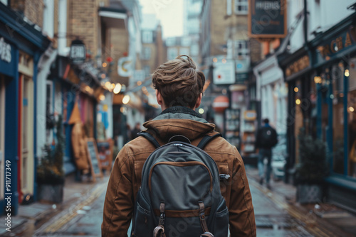 man, walking, cloudy day, urban setting, street, casual attire, soft light, city life, sidewalk, cloudy sky, street scene
