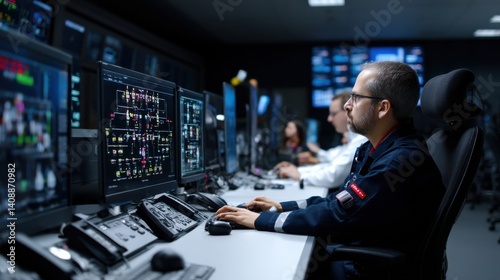 man, sitting, desk, several, computer, monitor, front, black, wearing, concentration, working, jacket, concept, production, system, technology, room, security, screen, engineer, office, person, control, operator, display, digital, equipment, information, technician, center, datum, safety, surveillance, male, specialist, business, protection, guard, young, video, supervision, industrial, factory, network, service, software, modern, dark, men at work
