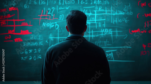 man, standing, front, blackboard, looking, board, serious, education, mathematic, complex, expression, blackboard, formula, chalk, school, drawing, studying, class, hand, concept, science, student, university, classroom, mathematic, teacher, algebra, learn, theory, lesson, person, college, scientist, physics, cognition, caucasian, write, solution, complexity, calculate, background, white, research, male, symbol, young, children, number
