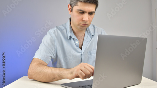 A man is typing on a laptop standing on a table