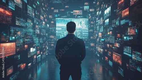 A Man Looks at Digital Screens in a Futuristic Corridor