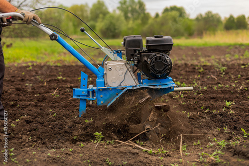 A man plows the ground with a blue walk-behind tractor. Spring agricultural work. Sowing work. Manual transport.