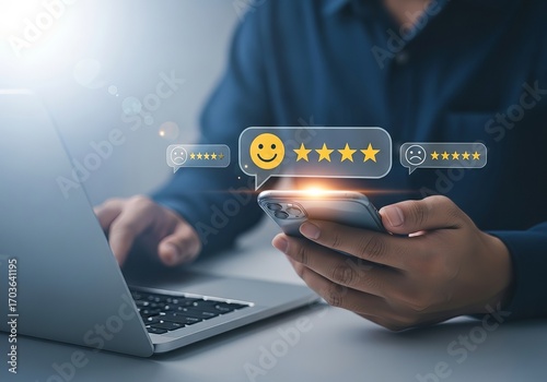 A man reviews feedback on his smartphone while using a laptop, showcasing a digital interaction with ratings and comments.